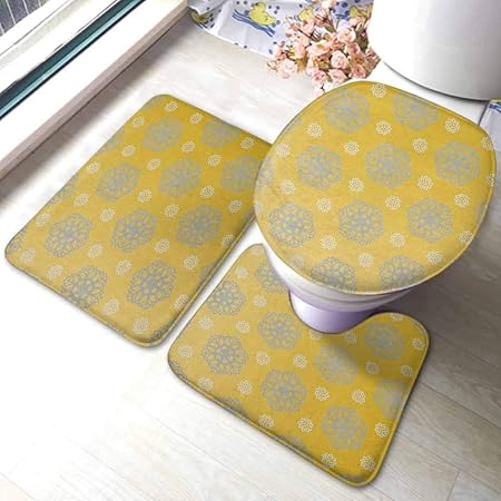 BOBO-Shop Alfombrillas de baño Grises y Amarillas Baño Imagen Retro Vintage Bohemia de Flores Swilrs Lámina Estera de Inodoro en Forma de U, Tapa del Inodoro Tapa Caléndula Azul Gris y Blanco: